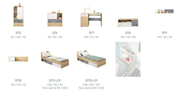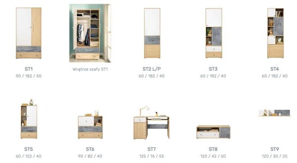 omare, pisalne mize, stoječe police z predali,ter komode. Pohištvo za mladinske sobe