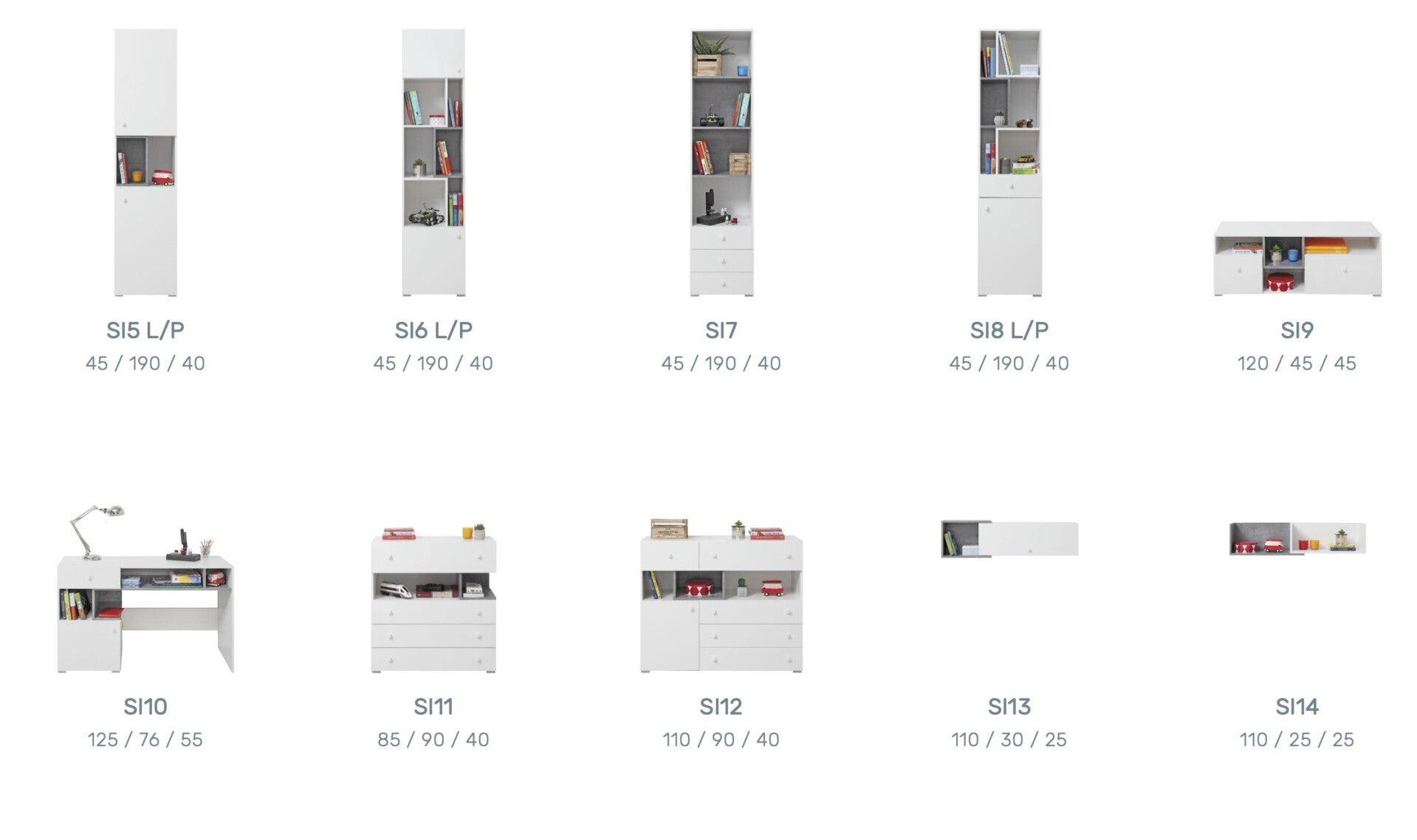 pisalne mize, viseče police ter 2 poličnika z vrati in predali in policami. Pohištvo za